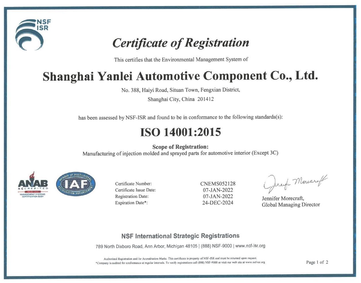 2018年12月份獲得了環境ISO 14001認證證書